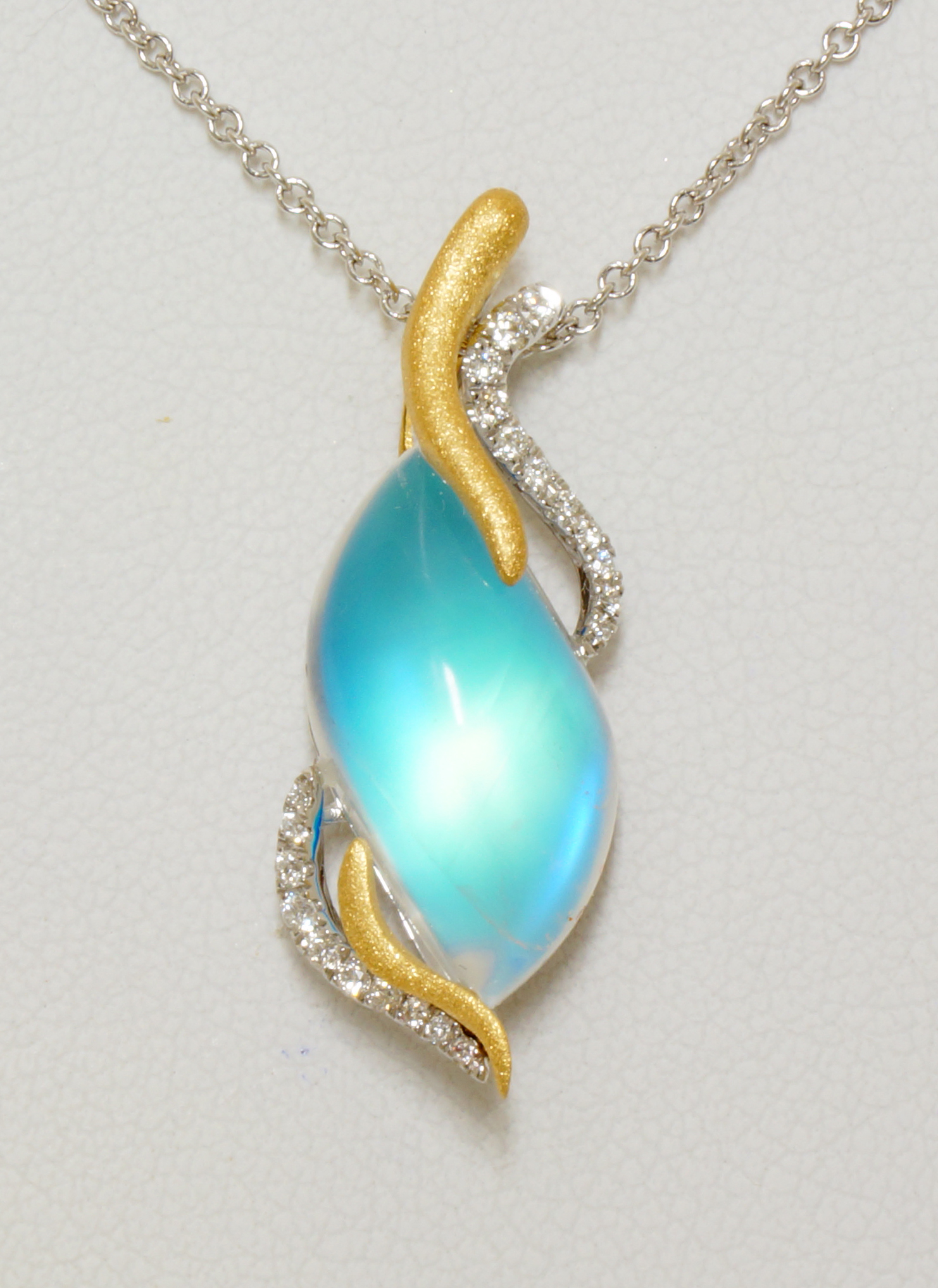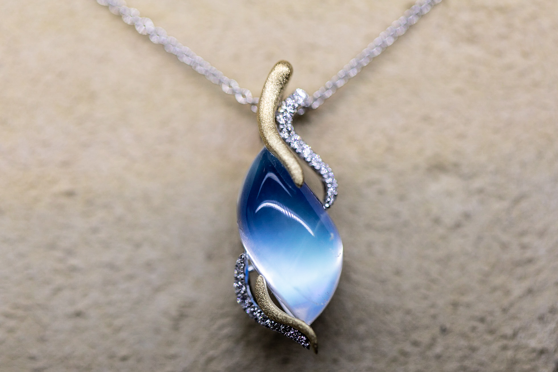 3rd Place - THE BLUE WAVE: by Denny Wong - Denny Wong Designs. The ultimate surfing experience is surfing inside a closing wave - surfing the blue room that Oahu’s pipe line is so famous for. This pendant, holding a compound wave shape blue moonstone captures the excitement of this experience beautifully in 18 karat gold.
