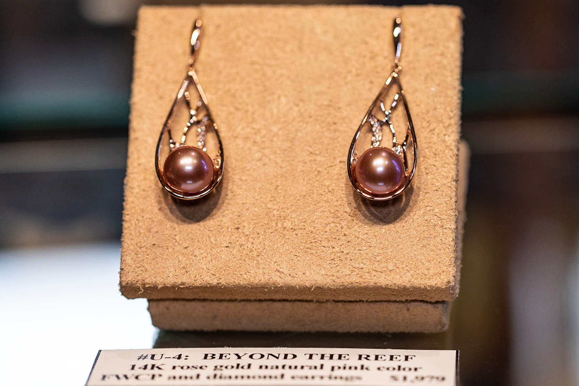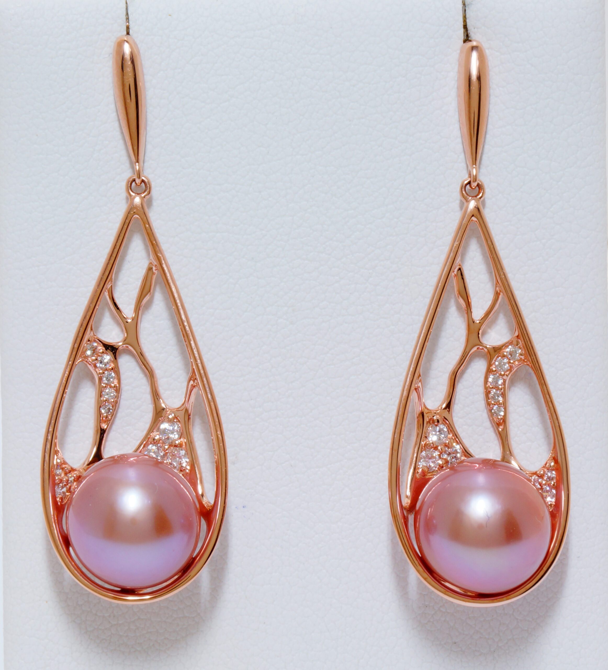 3rd Place - BEYOND THE REEF: by Carrie Nottage Smith - Na Hoku. Beyond the reef is where the excitement of the open ocean begins. These beautiful, deeply sculpted rose gold dangle earrings with natural pink fresh water pearls, brilliantly decorated with sparkling diamonds capture this excitement wonderfully. Wear these earrings, beyond the reef.