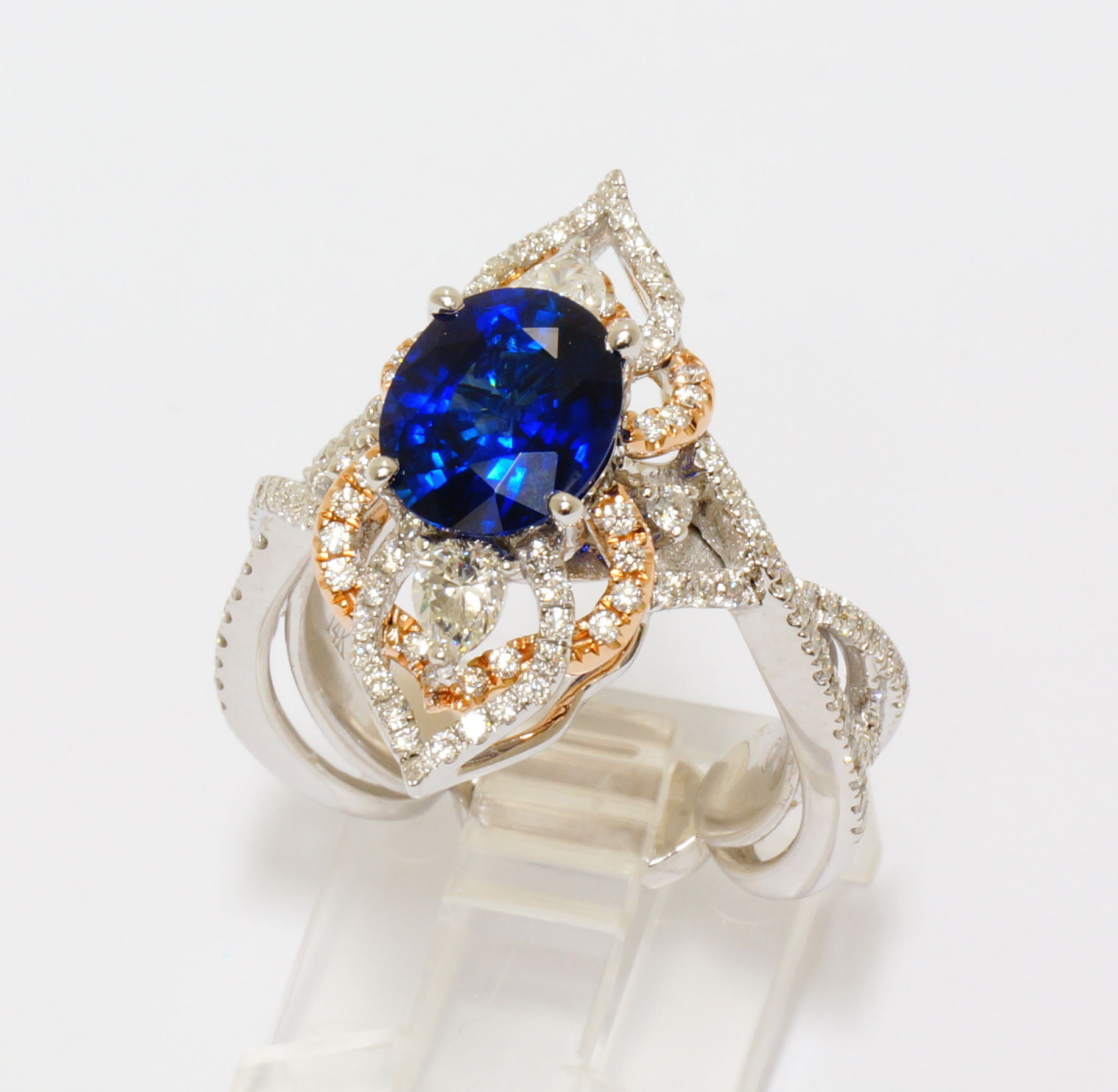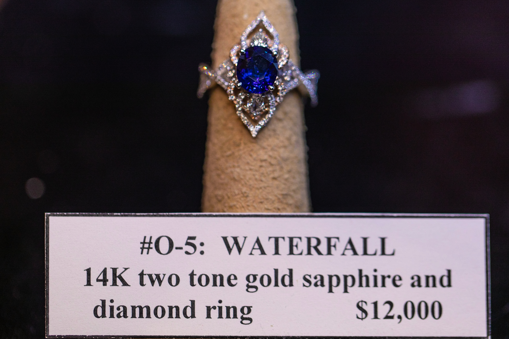 2nd Place – WATERFALL: by Denny Wong - Denny Wong Designs. This ring holds a lovely royal blue sapphire displayed in an ornate waterfall of shimmering diamonds. Finely crafted in 14 karat white and yellow gold it has incorporated into its design an integrated butterfly insert providing amazing luxury in its fit and feel.