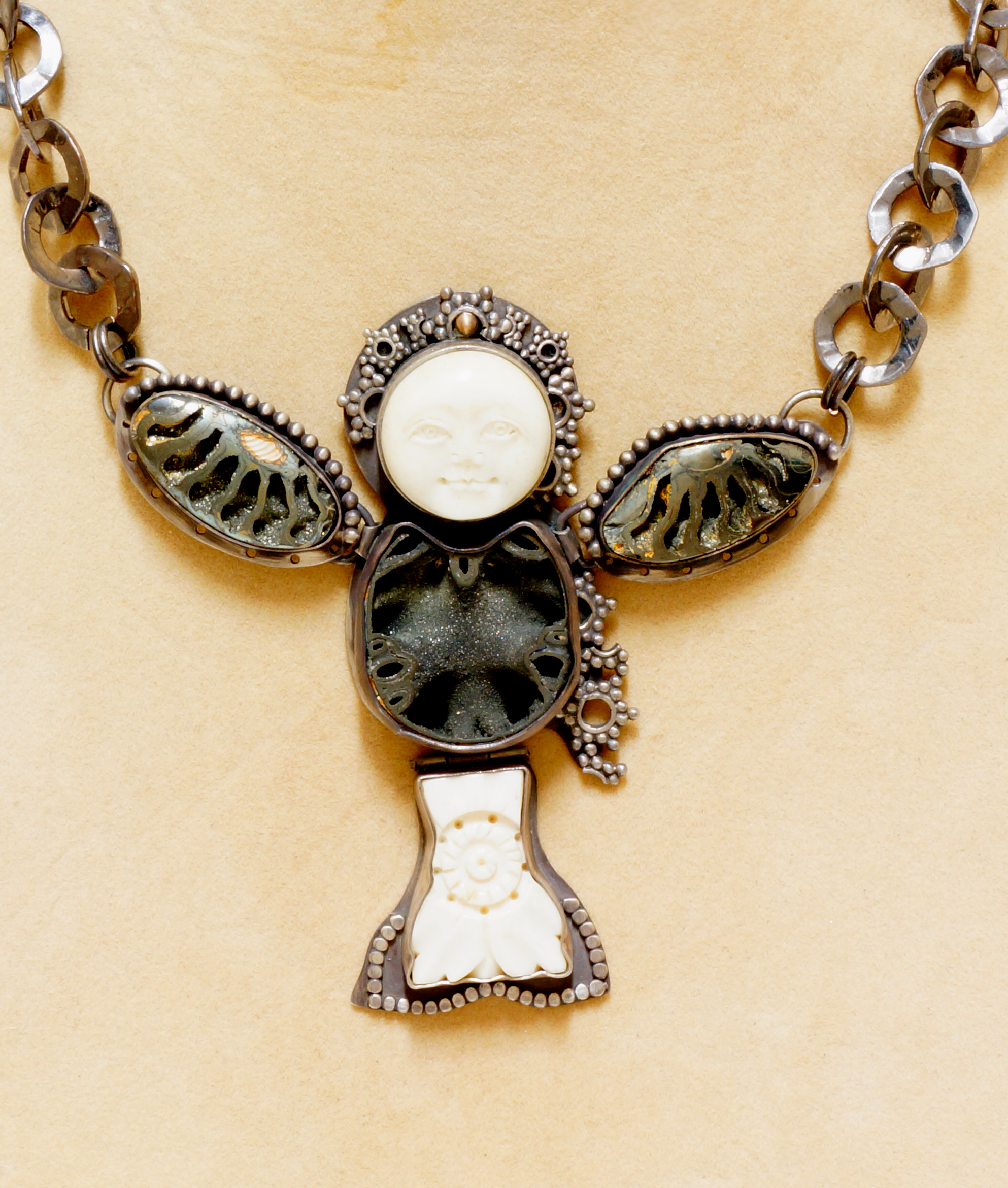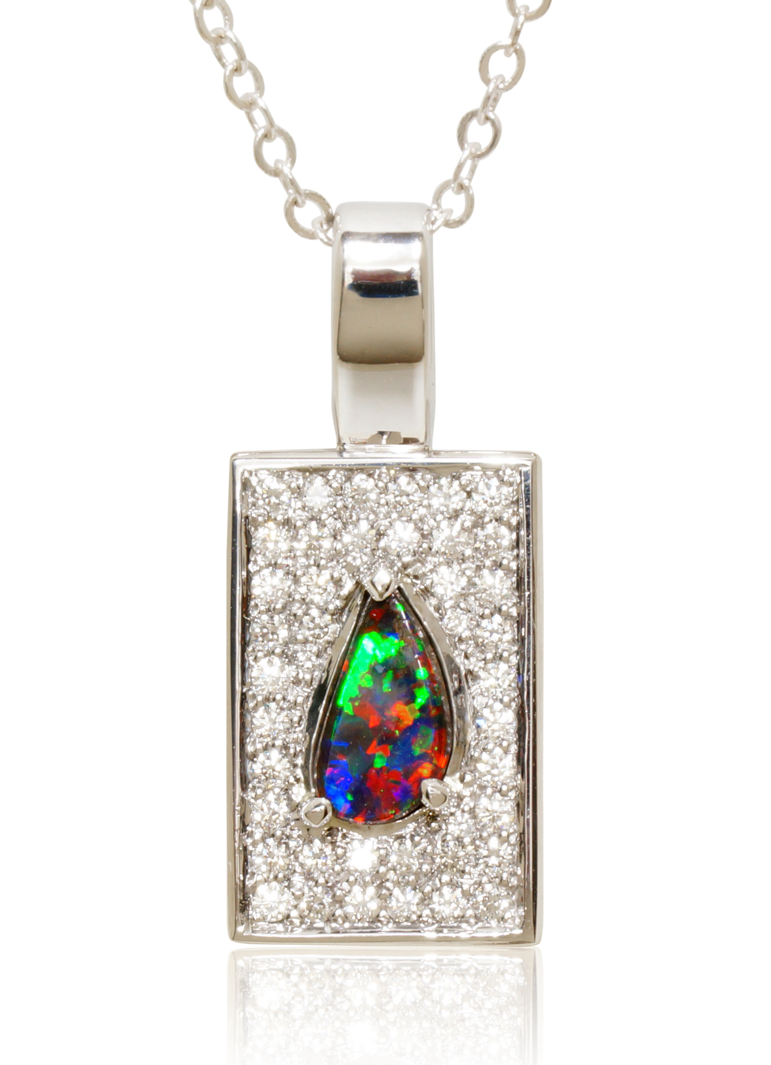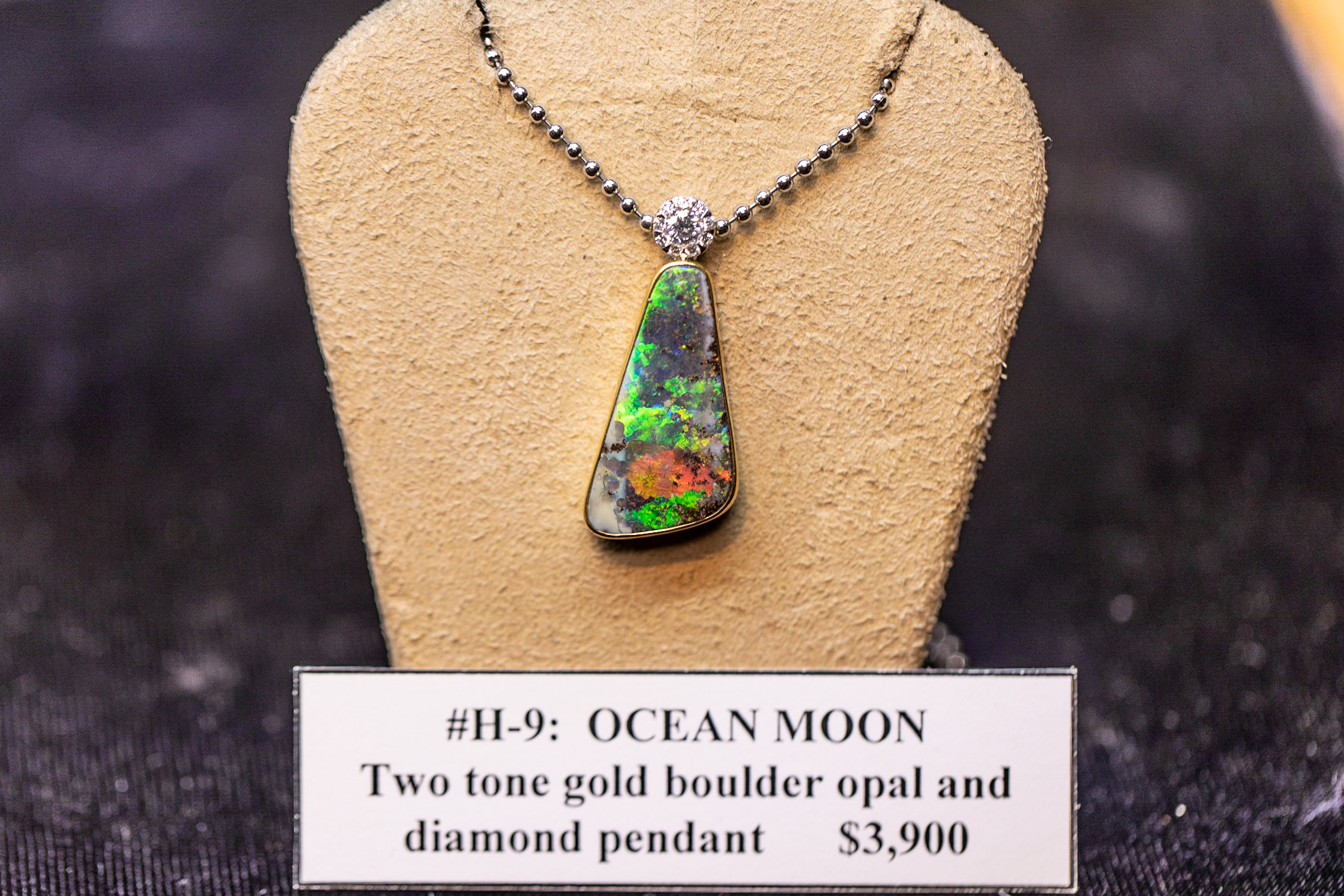2nd Place – OCEAN MOON: by Jane Chen - Opal Fields. Like the moon resting on the night ocean horizon, these pendant features a colorful reflective boulder black opal under a sphere of brilliant illusion set diamonds. The perfect attire for any tropical evening.