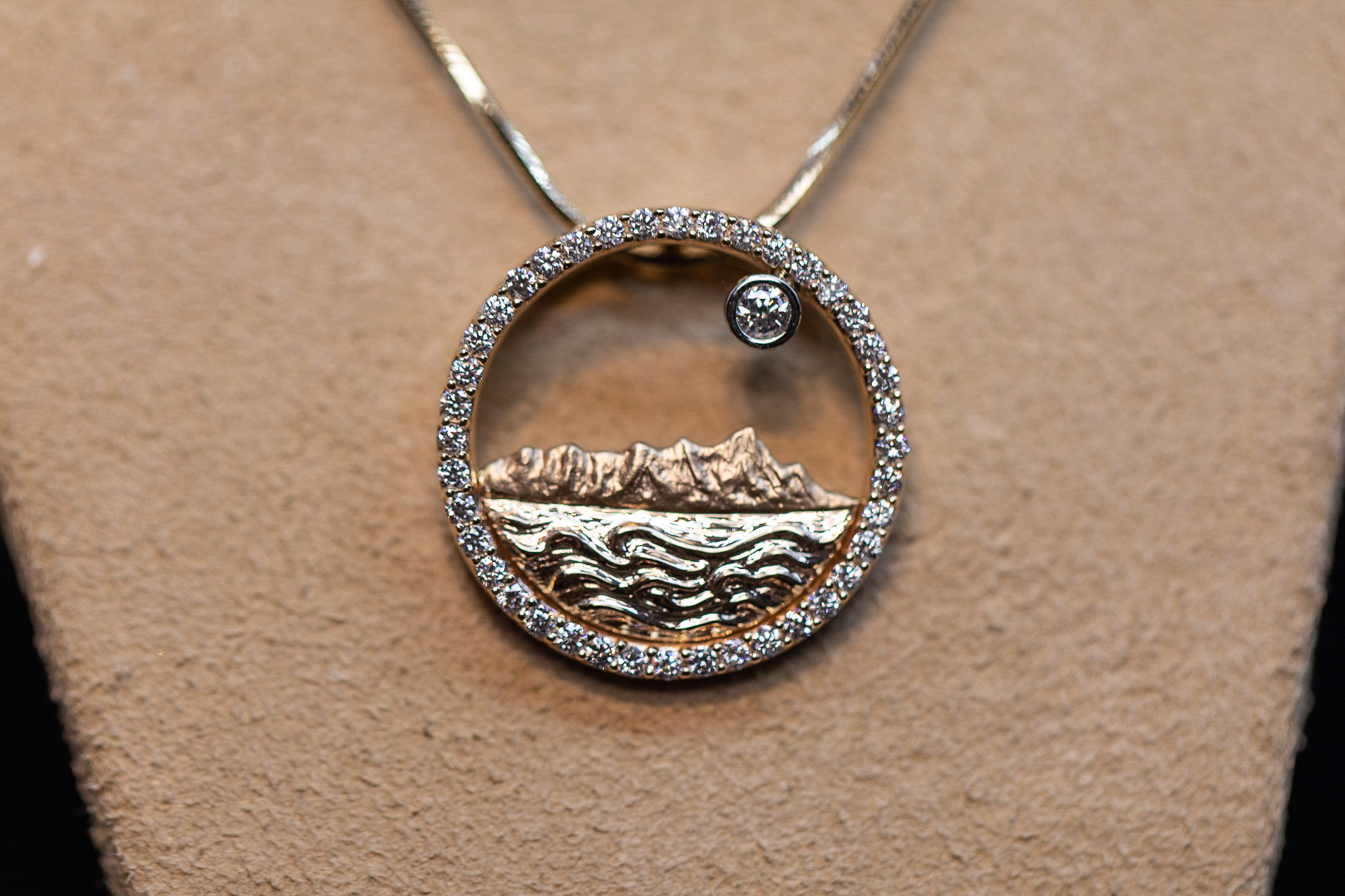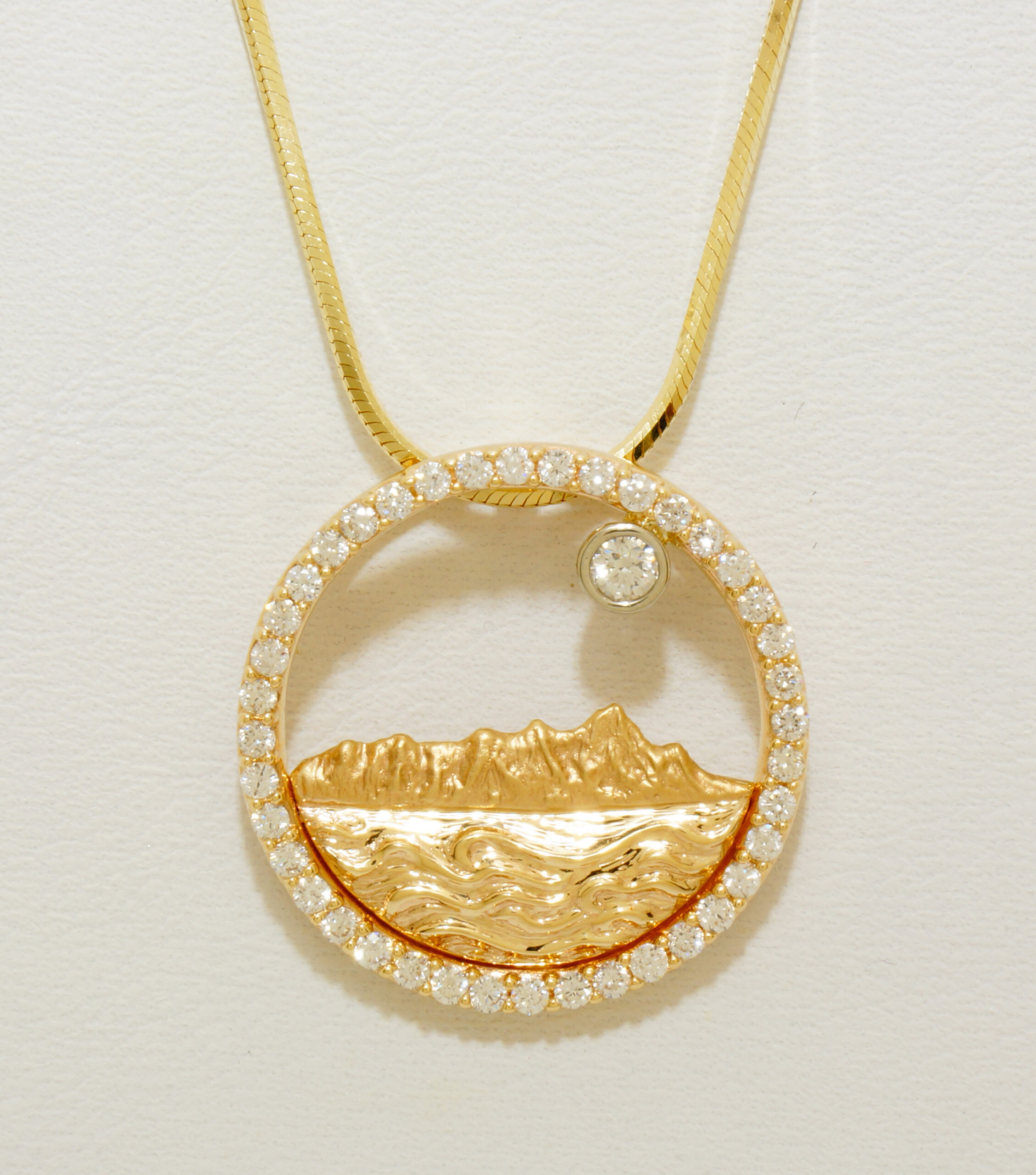 1st Place – MOON OVER DIAMOND HEAD: by Na Hoku design team - Na Hoku. No view is more iconic than that of Diamond Head seen across the ocean waters of Waikiki. This some what demure pendant sculpted in gold and enhanced with diamonds beautifully captures the magnificence of viewing the moon over Diamond Head.