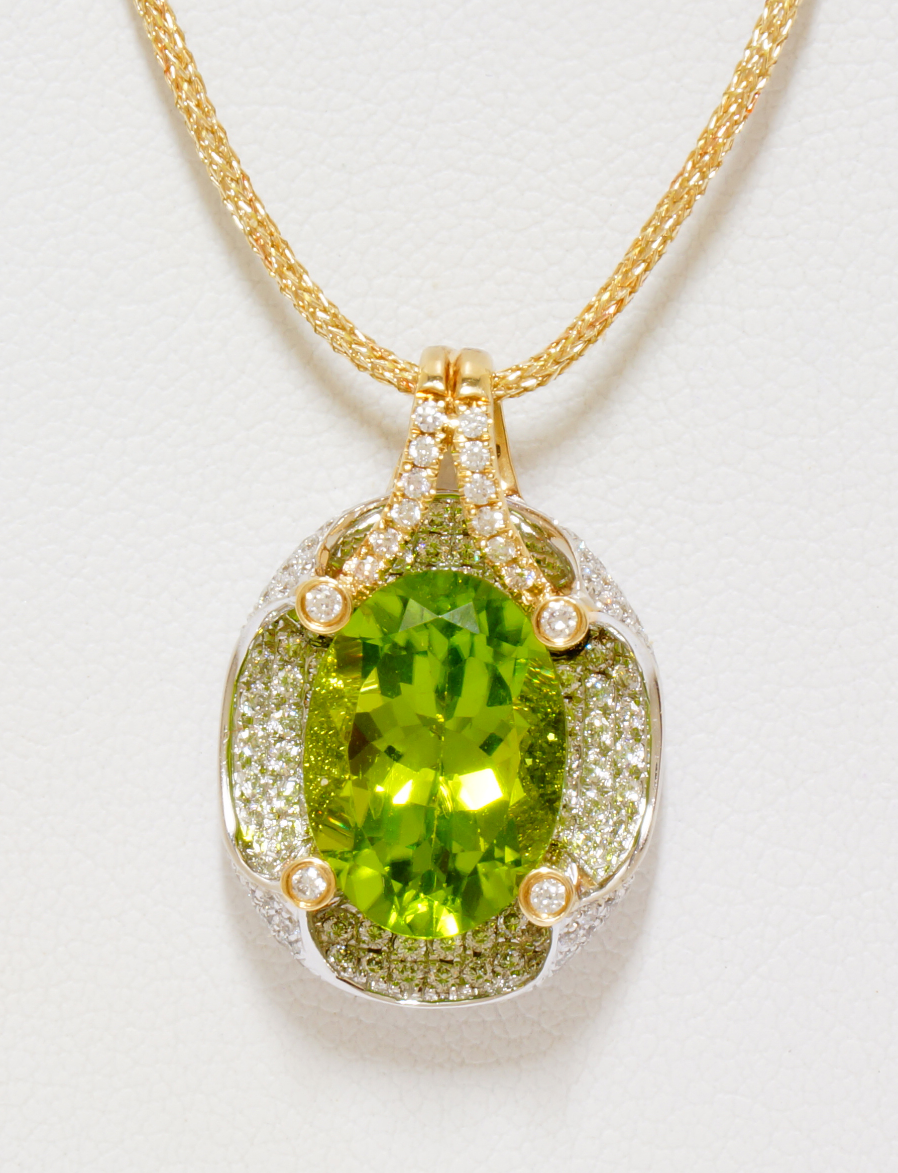 1st Place – LOTUS: by Dona Wong - Keoni Collection. Shimmering like the morning’s dew on a lotus flower, micro pave` diamonds around and behind highlight an exquisite peridot gem. All masterfully crafted in 14 karat white and yellow gold.