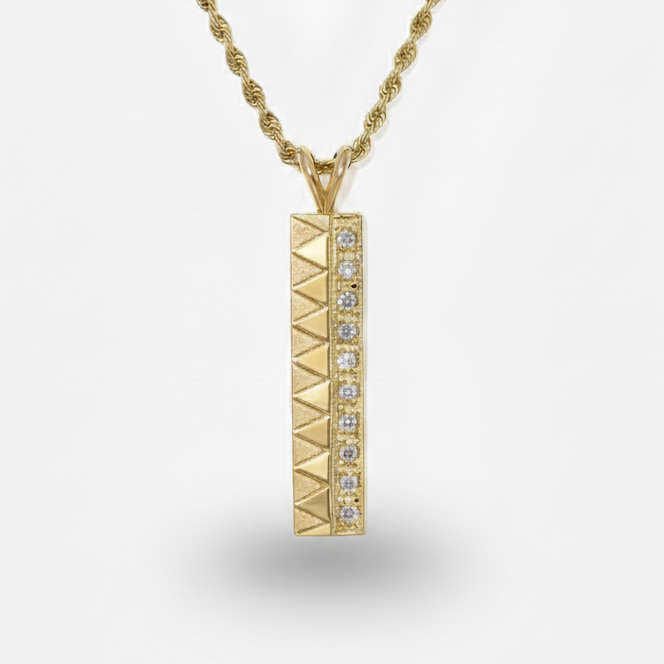 This captivating pendant is a celestial tribute to the ancient Hawaiian navigators who charted their course by the stars. Named Hōkūala, meaning "Pathway of the Stars" in Hawaiian, this piece honors the guidance, courage and timeless beauty of those journeys. Crafted in rich 14K yellow gold, this pendant is hand-engraved with precision, featuring a mesmerizing pattern of geometric triangles reminiscent of Hawaiian kakau and ohe kapala designs. A vertical row of brilliant diamonds symbolizes the guiding stars that light the way across vast oceans and time. The contrast between the textured gold and the sparkling diamomds creates an enchanting balance of earth and sky, tradition and modern elegance.