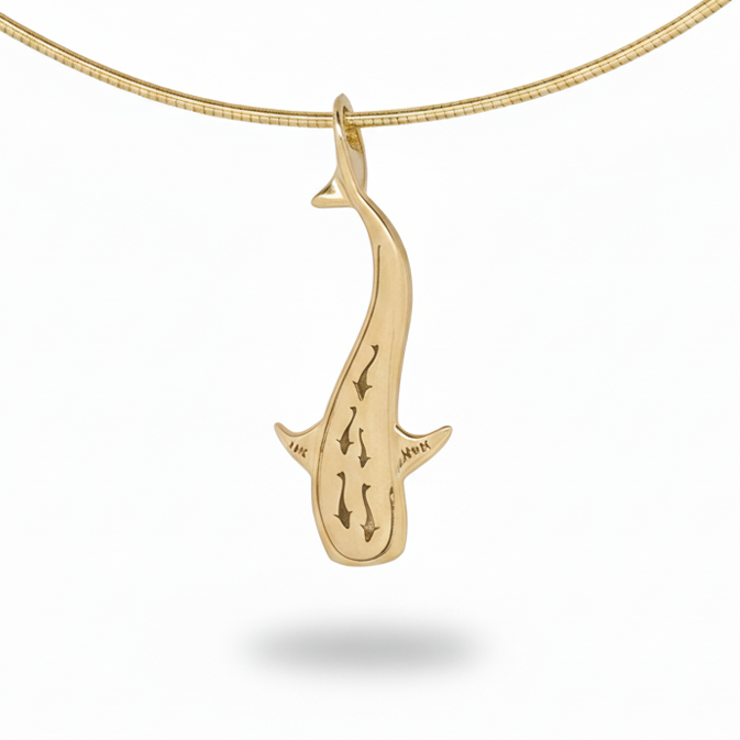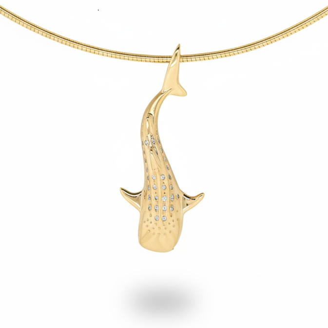 14k gold whale shark pendant. This gentle giant of the Hawaiian open ocean is encrusted with 30 diamonds and features a school of remora dancing across its belly.