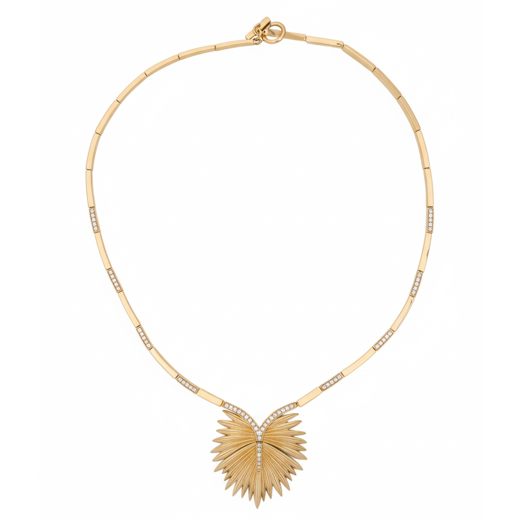 14k yellow gold handmade linked necklace with 1.0 ctw of diamonds. The Loulu is endemic to Hawaii and to Oʻahu in particular. The palm is symbolic of peace, celebration and good luck.