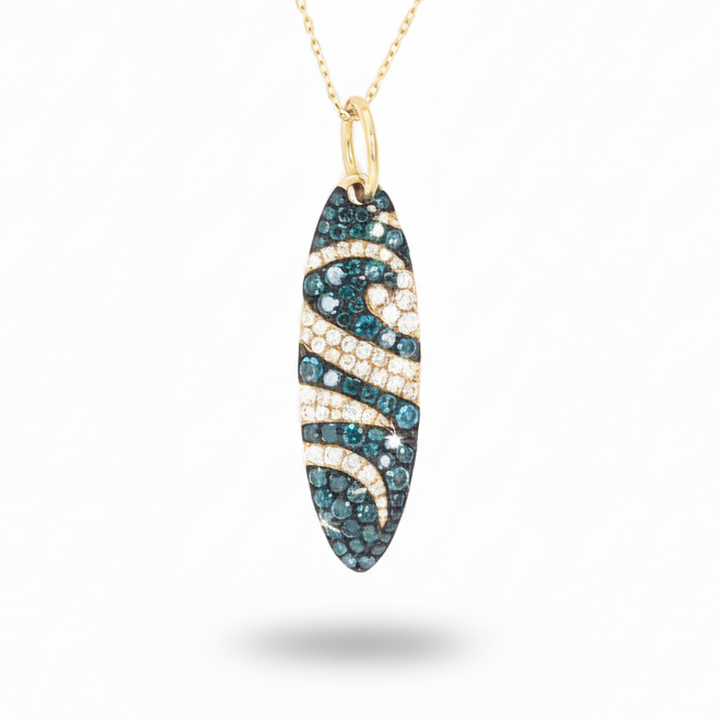 14K yellow gold surfboard set in 0.45 ctw of VS diamonds and 0.75 ctw of blue diamonds.