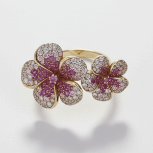 14K yellow gold double plumeria ombre ring, with 0.95 ctw of white sapphires and 2.06 ctw of pink sapphires.