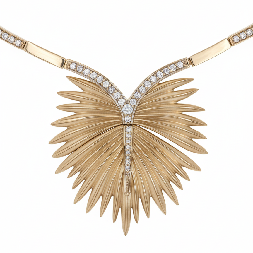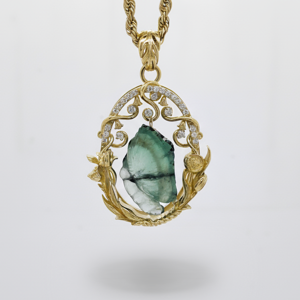 A celebration of nature's most enchanting transformation, Mariposa features an extraordinarily rare Colombian Trapiche emerald--meticulously carved into the delicate form of a butterfly. The emerald's natural spoke pattern accentuates wings in motion, symbolizing harmony and renewal. The butterfly flutters through an etherial 18K yellow gold garden, where hearts-and-arrows diamonds glisten like morning dew, illuminating the piece with both precision and poetry. A masterpiece of artistry and gemological rarity, Mariposa captures a fleeting moment of beauty--forever suspended in gold and light.