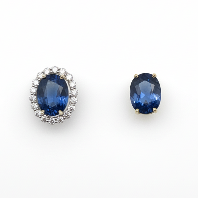 These sapphire earrings celebrate both the quiet intimacy of a deep connection and the dazzling joy of shared celebration. At their core rests a pair of exceptional Sapphire Gems precision set in 18 karat yellow gold post-style earrings. Worn alone, they are an elegant whisper of devotion, a classic promise of love that needs no adornment to be profound. But when the moment calls for a flourish, they can be dramatically transformed, surrounding the sapphires with brilliant, shimmering diamonds in 18 karat white gold jackets meticulously crafted to form a halo of brilliance around the oval sapphires. Whether presented as the classic sapphire stud for daily reassurance or fully adorned for a night of breathtaking romance, these earrings offer a beautiful duality ready to be styled for every chapter of life's journey.