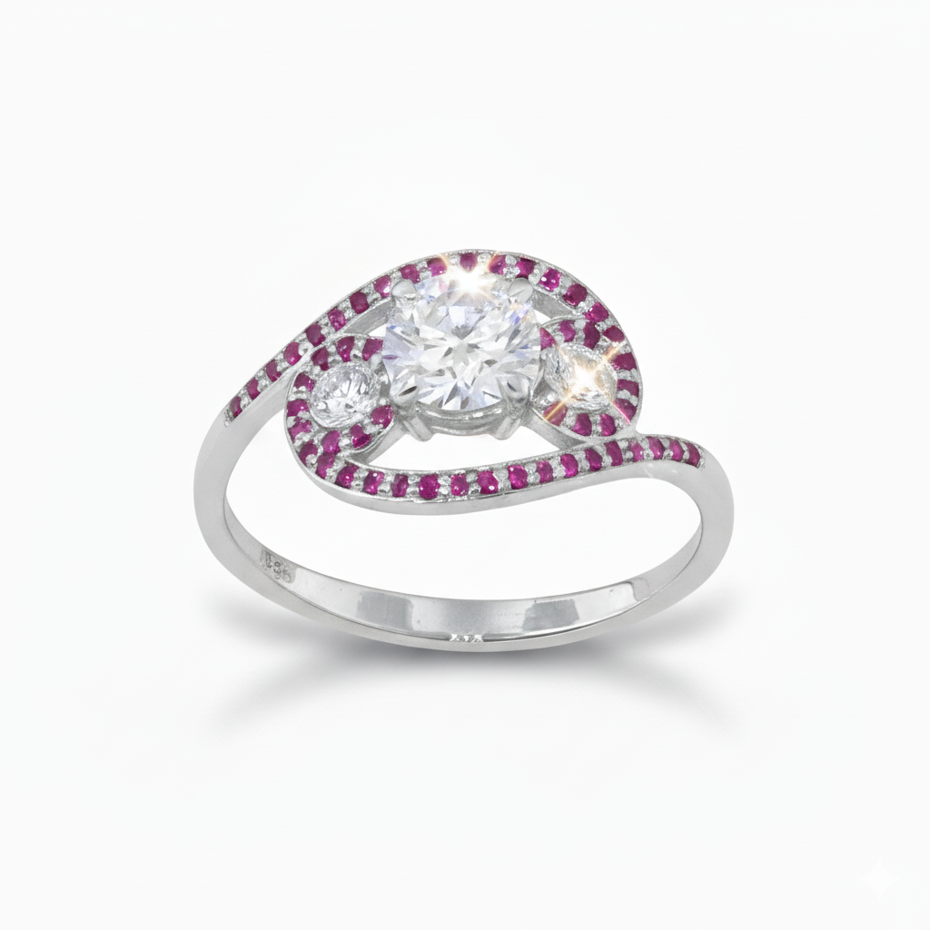This glittering bypass ring shows the astrological symbol for Cancer, known as Karkinos in the original Greek. The symbol is draw out in tiny rubies each literally smaller than a gnat, surrounding a half-carat F-color SI clarity center diamond and two smaller side stones of matching color and clarity. Set in lustrous 18K white gold, unplated to show the true luster of the metal.