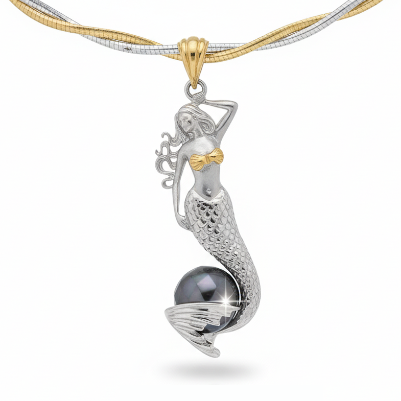 This Siren rises from the depths carrying an exquisite treasure, a faceted 10mm Tahitian pearl. Her matte-finished sterling silver skin exhibits a dewy appearance, kissed with 14 karat yellow gold accents.