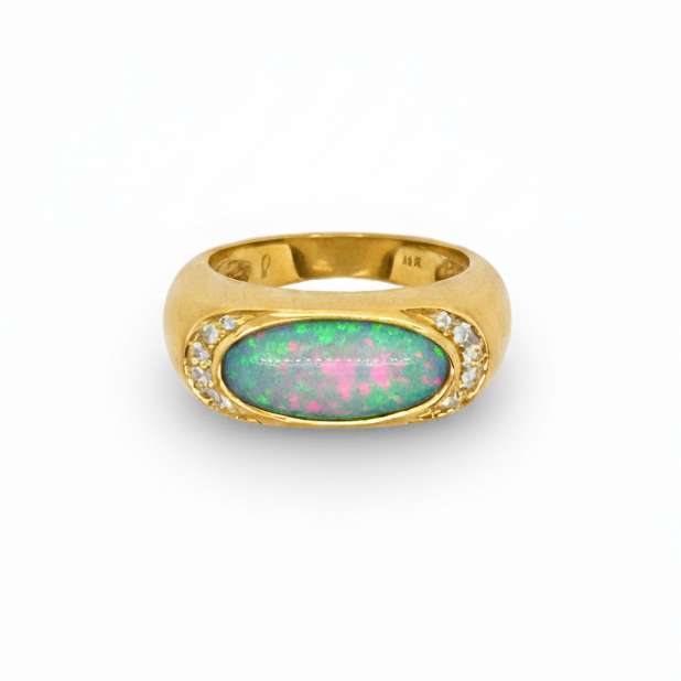 Expertly crafted in 14 Karat gold, featuring a gem boulder opal and accented with brilliant hearts and arrows diamonds. This is the ring for a love as vast and unpredictable as the ocean itself. "Life's a Beach," it’s a promise to find joy in the waves and solace in the sand, always together. A miniature snapshot of the deep sea. It's rich, play-of-color erupting across its surface like the sun-drenched moments of a perfect coastal day. A piece of the seaside, forever preserved on your hand.