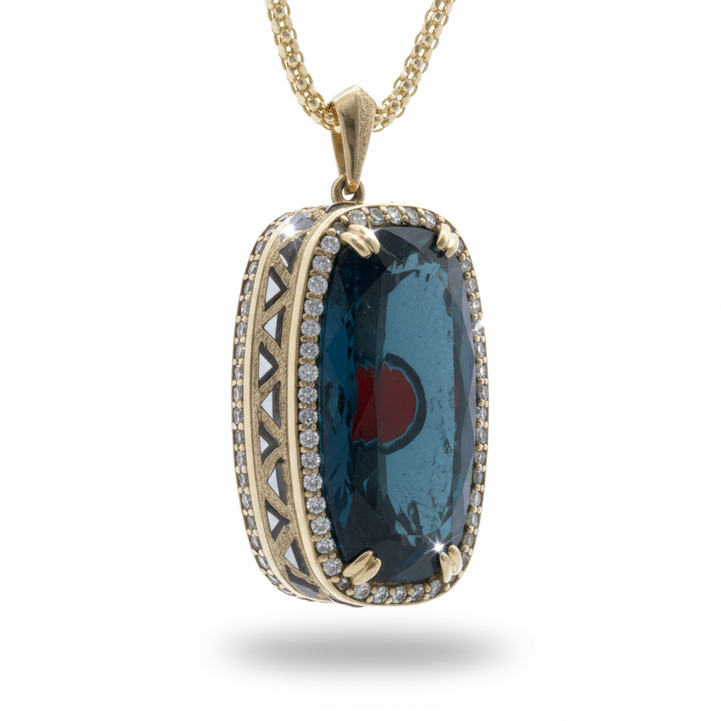 Kama'ehuakanaloa, formerly known as Lōʻihi, is a deep-ocean volcano on the SE flank of Mauna Loa. Here, the molten caldera is represented by a vibrant Ethiopian fire opal glowing through the pelagic depths of a 24.5 ct London blue topaz, surrounded by 0.94 ctw of round brilliant whitecaps and 2.1 ctw of black diamonds niho-niho pattern seamounts set in 14k gold. The lozenge shape of the pendant refers to the old name "Lōʻihi" which means long, like the shape of the volcano itself. The opal, visible from the back, is surrounded by a stylized web of intaglio lava flows weaving over each other.