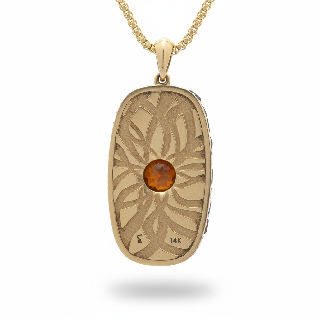 Kama'ehuakanaloa, formerly known as Lōʻihi, is a deep-ocean volcano on the SE flank of Mauna Loa. Here, the molten caldera is represented by a vibrant Ethiopian fire opal glowing through the pelagic depths of a 24.5 ct London blue topaz, surrounded by 0.94ctw of round brilliant whitecaps and 2.1 ctw of black diamonds niho-niho pattern seamounts set in 14k gold. The lozenge shape of the pendant refers to the old name "Lōʻihi" which means long, like the shape of the volcano itself. The opal, visible from the back, is surrounded by a stylized web of intaglio lava flows weaving over each other.